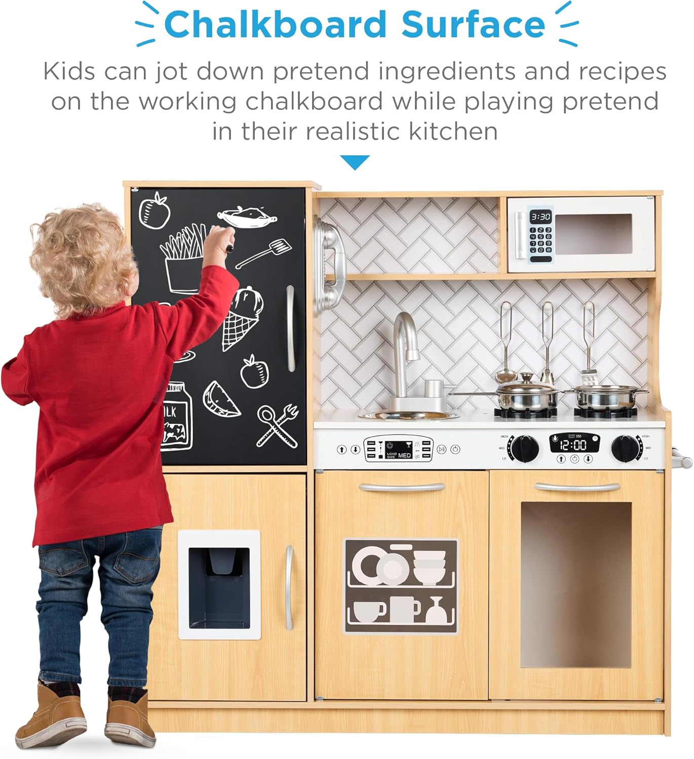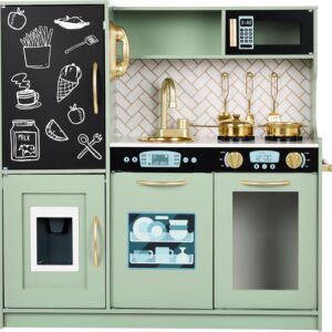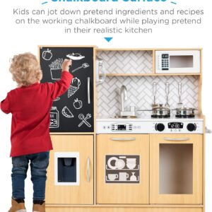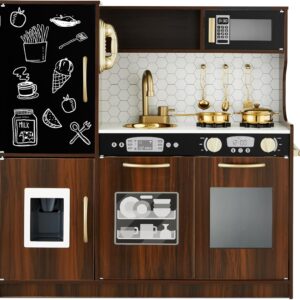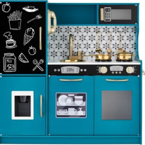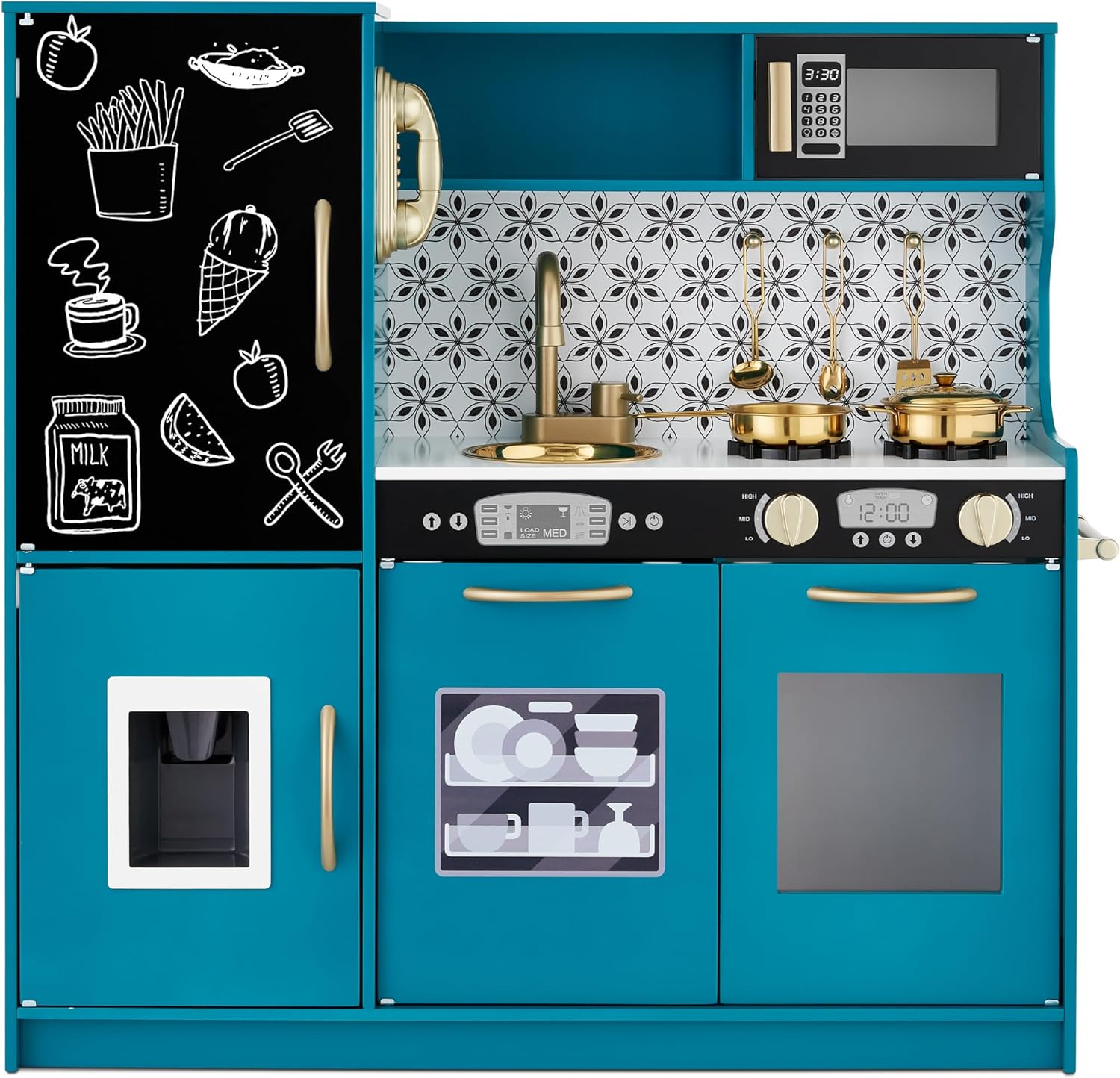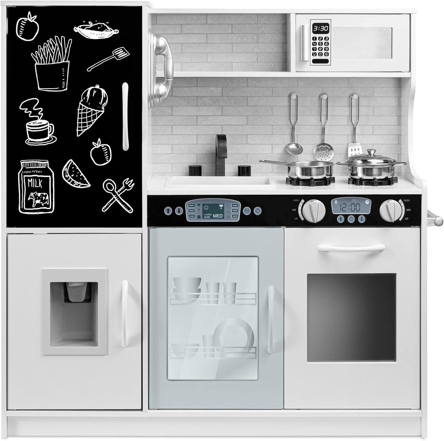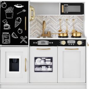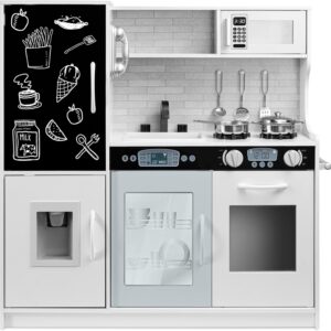 - CHALKBOARD SURFACE: Little chefs can jot down notes on the chalkboard surface as they play with this large set made with a realistic design that mimics a real kitchen, designed for their size, and have fun playing with the ice maker, microwave, phone