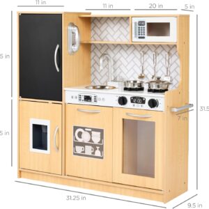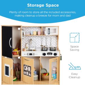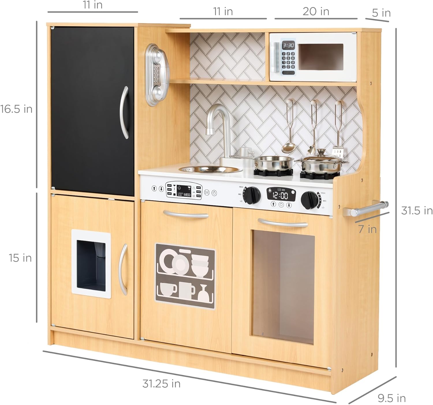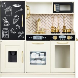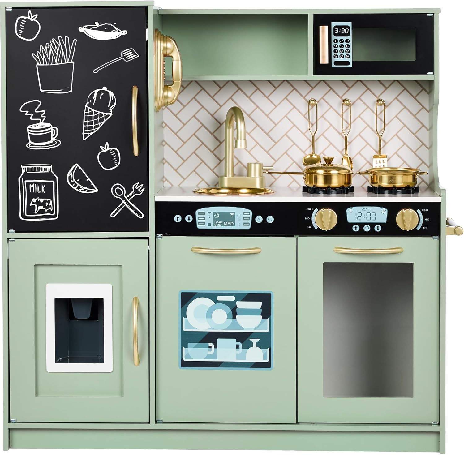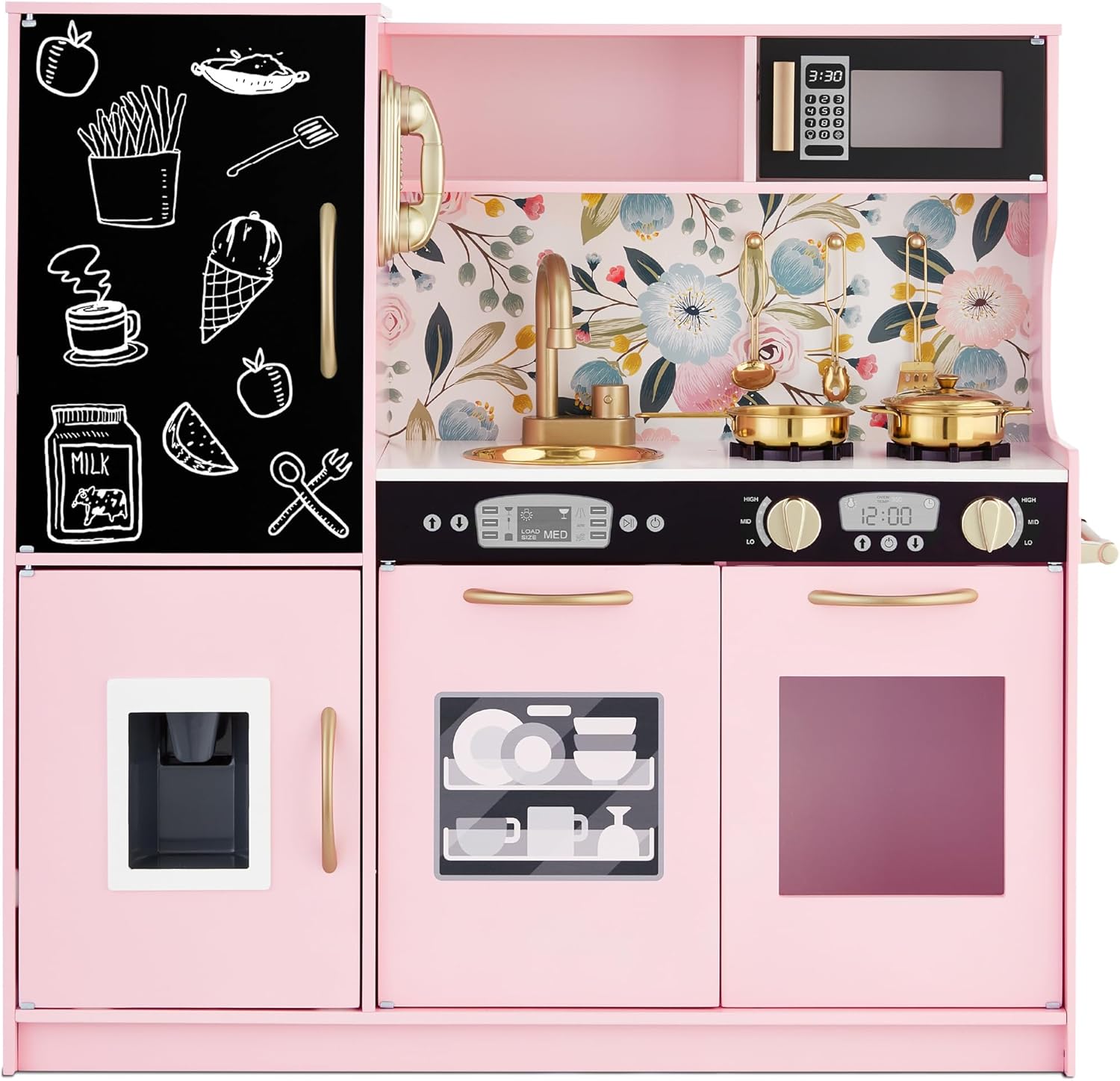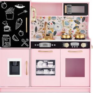 - CHALKBOARD SURFACE: Little chefs can jot down notes on the chalkboard surface as they play with this large set made with a realistic design that mimics a real kitchen, designed for their size, and have fun playing with the ice maker, microwave, phone