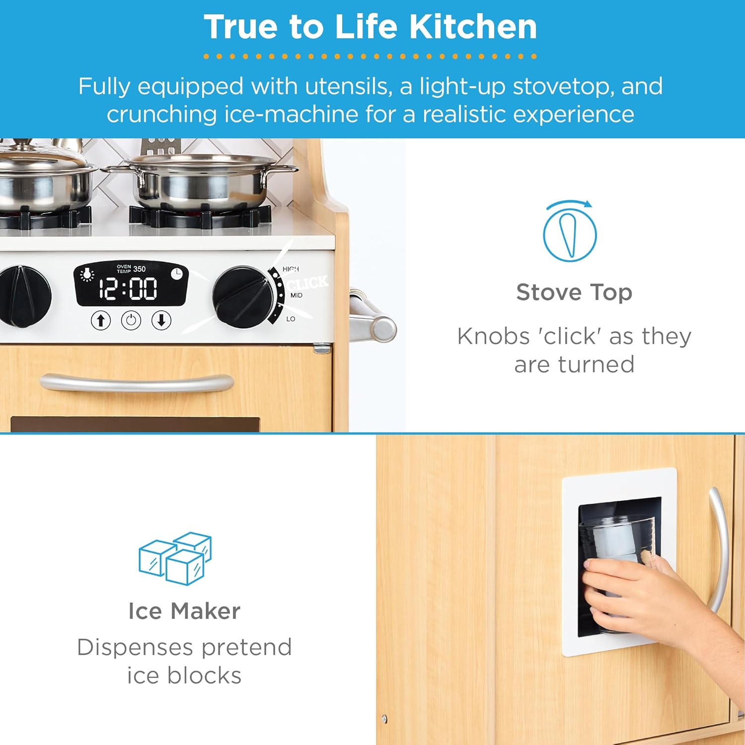- TRUE TO LIFE KITCHEN: Your child can get a true experience with features like a towel rack and ice machine, and realistic sounds like the "click" of the oven knobs as they pretend to bake and cook in a designer kitchen with a modern backsplash